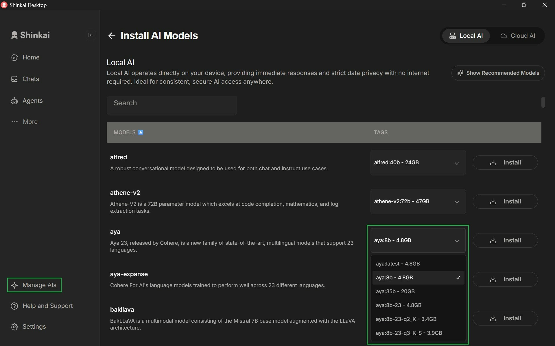 Shinkai offers you a wide array of models to choose from. To browse the whole list of local AI models in Shinkai, click theAIs option of the left side menu > Click the Show all models option below the recommended models.