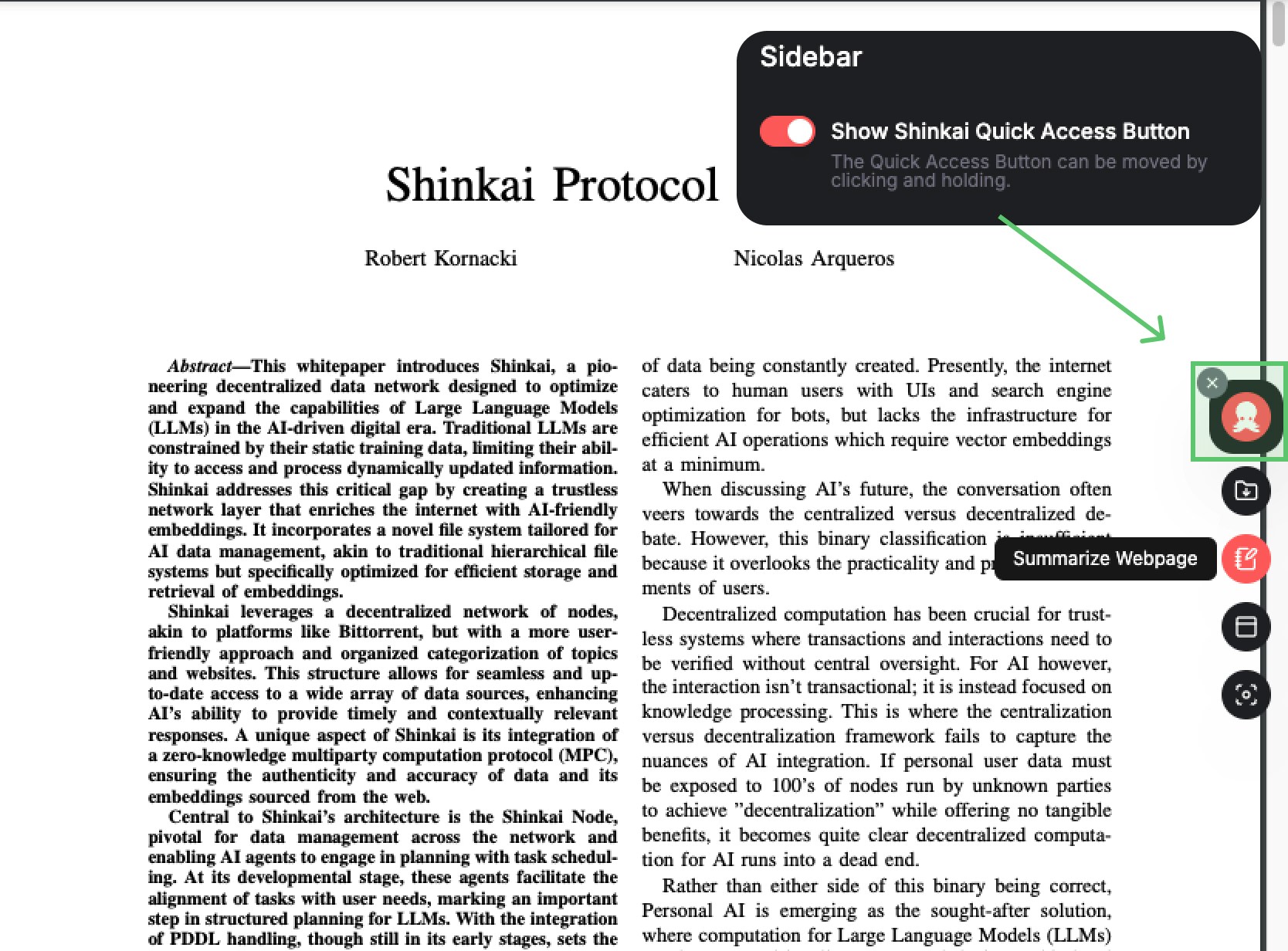 Shinkai’s Visor offers a streamlined, quick-access interface, enabling you to interact with Shinkai’s powerful AI capabilities directly from your browser. Once installed, you will see Visor’s quick-access feature enabled by default. Designed for efficiency, this feature ensures Shinkai’s tools are always just a click away, enhancing productivity without compromising privacy.