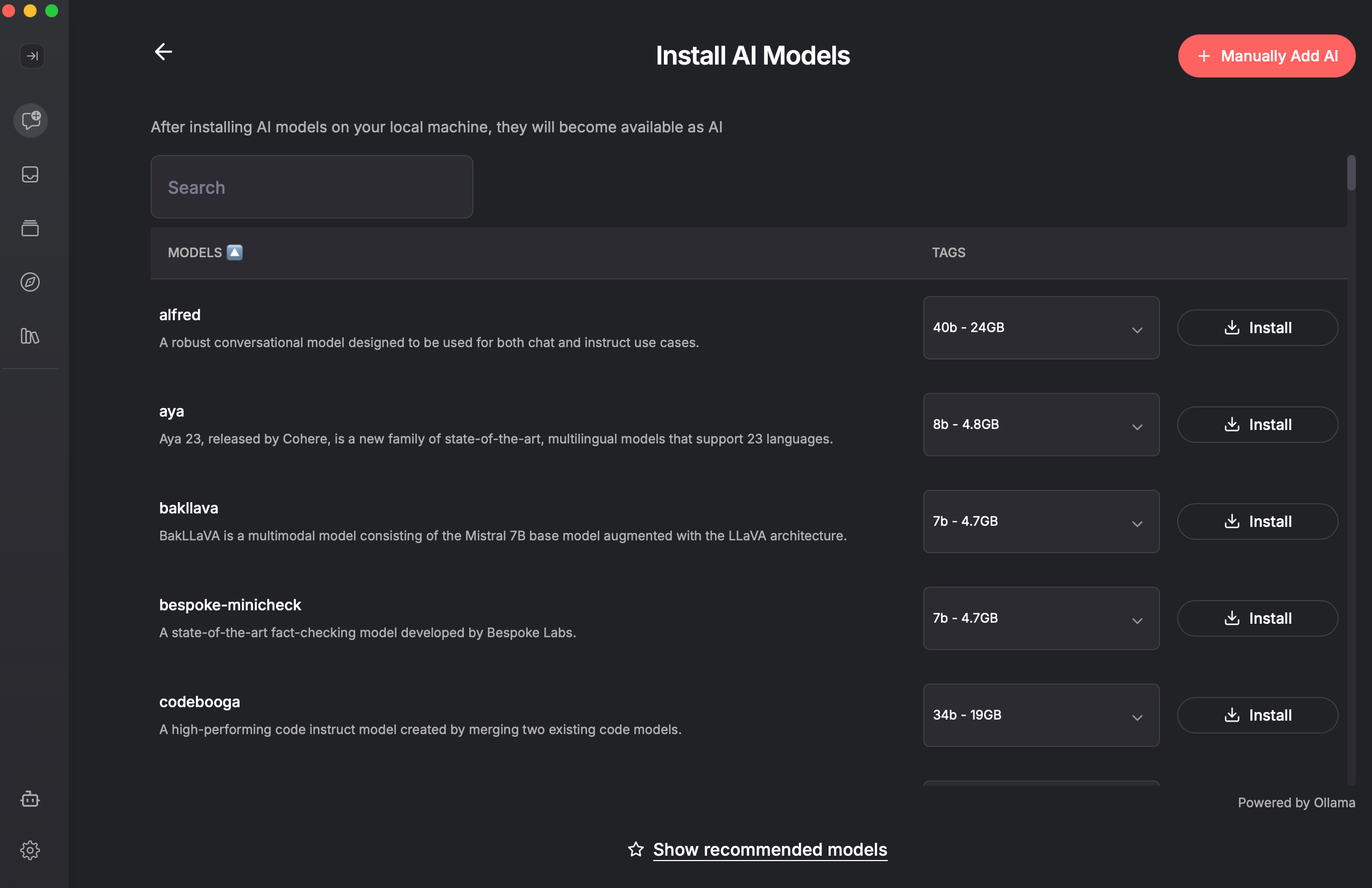 - 1Check if model is available for quick installationNote that all AI models in Shinkai are powered by Ollama. Before installing Ollama models manually, check the available models list for quick installation.