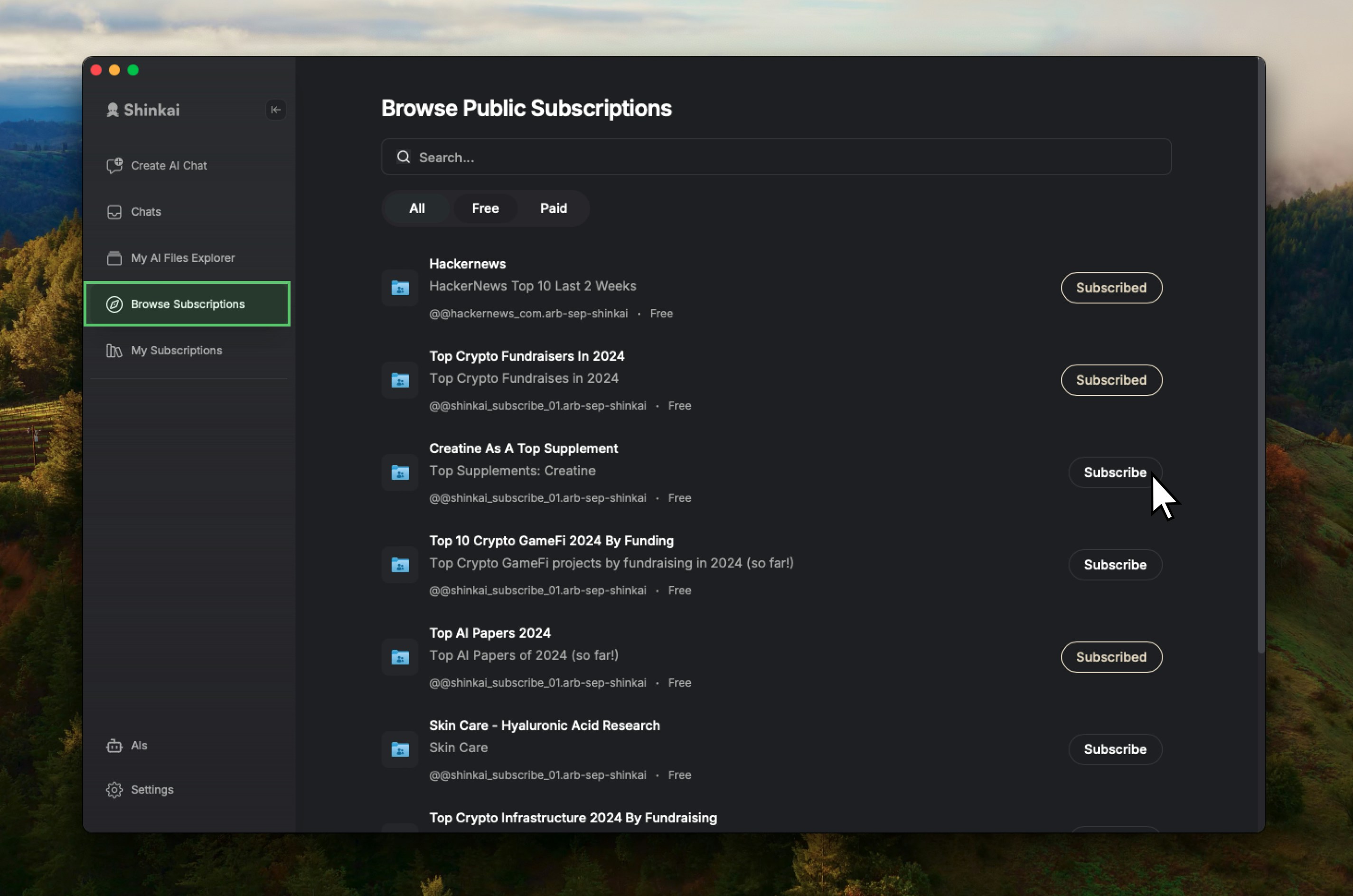 TheBrowse Subscriptions feature in Shinkai allows users to subscribe to up-to-date content from various sources across the decentralized Shinkai Network.